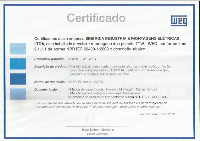 A empresa é credenciada a WEG para montagem de painel TTW conforme norma NBR IEC 60439-1:2003.